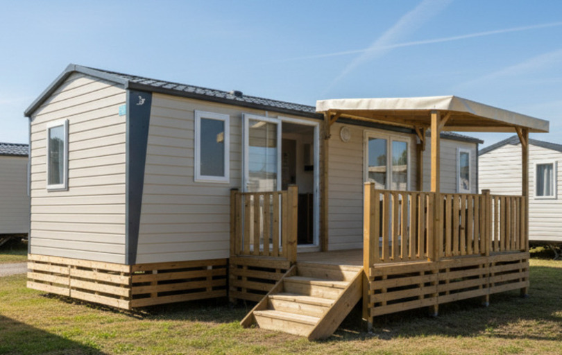 Coin salon/séjour : cuisine équipée (feux gaz, réfrigérateur/congélateur, cafetière à filtre, micro-ondes, vaisselle), climatisation, TV et radiateur dans le séjour.