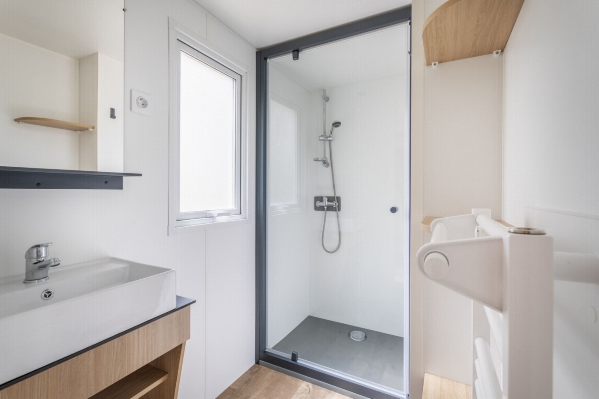 Sanitaire : salle d’eau avec douche et lavabo, WC séparé.