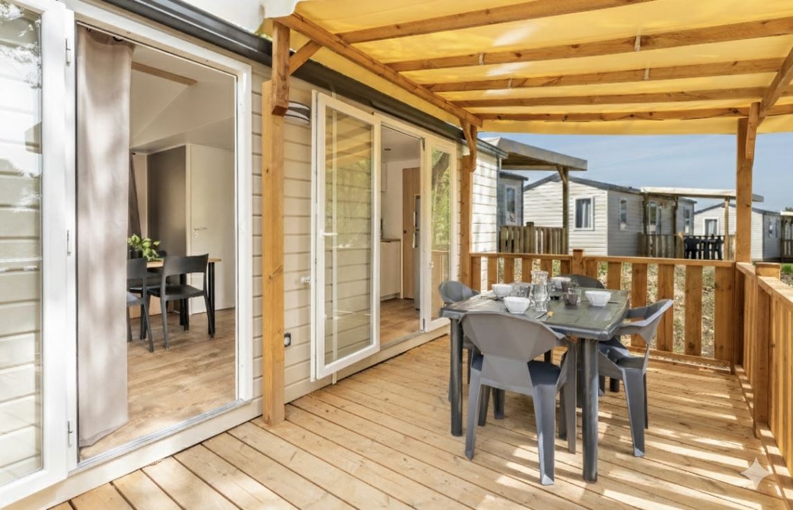 Extérieur : terrasse semi-couverte avec salon de jardin.