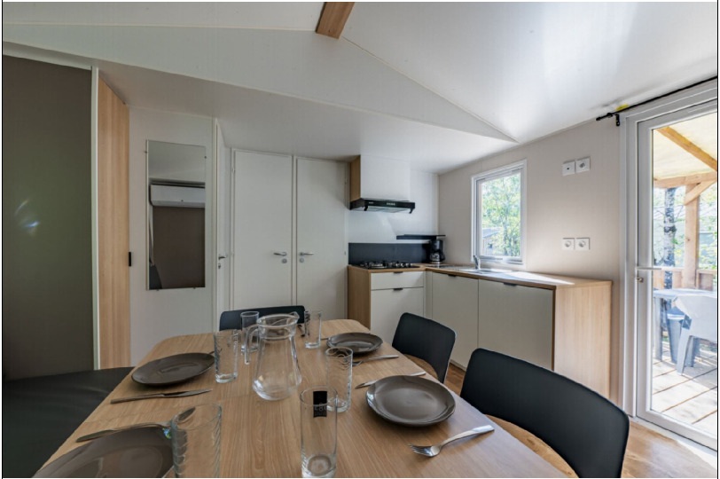 Coin salon/séjour : cuisine équipée (feux gaz, réfrigérateur-congélateur, cafetière à filtre, micro-ondes, vaisselle), radiateur dans le séjour et TV incluse.