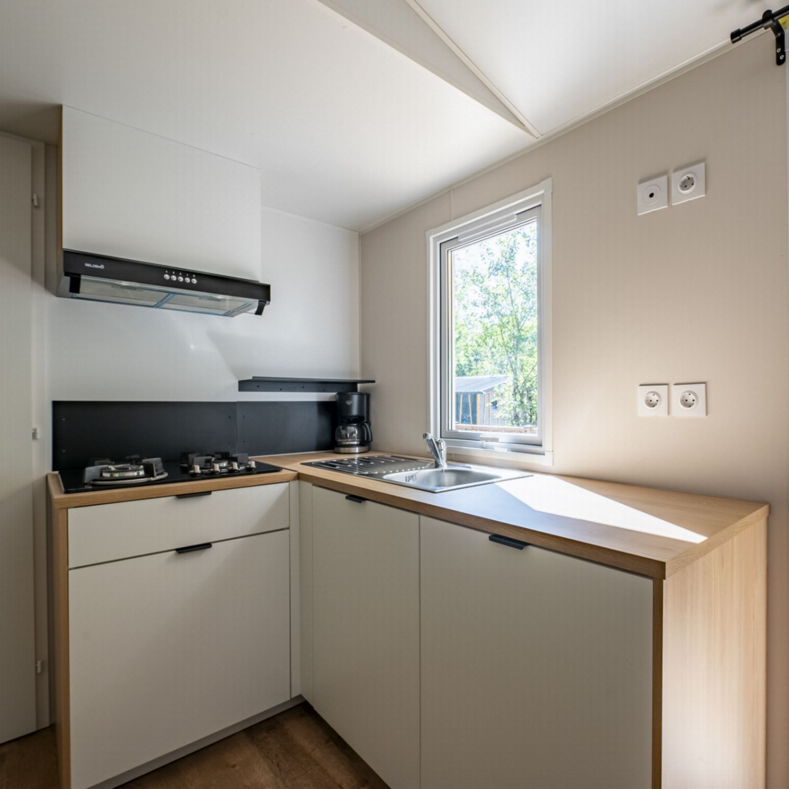 Coin salon/séjour : cuisine équipée (feux gaz, réfrigérateur-congélateur, cafetière à filtre, micro-ondes, vaisselle), radiateur dans le séjour et TV incluse.