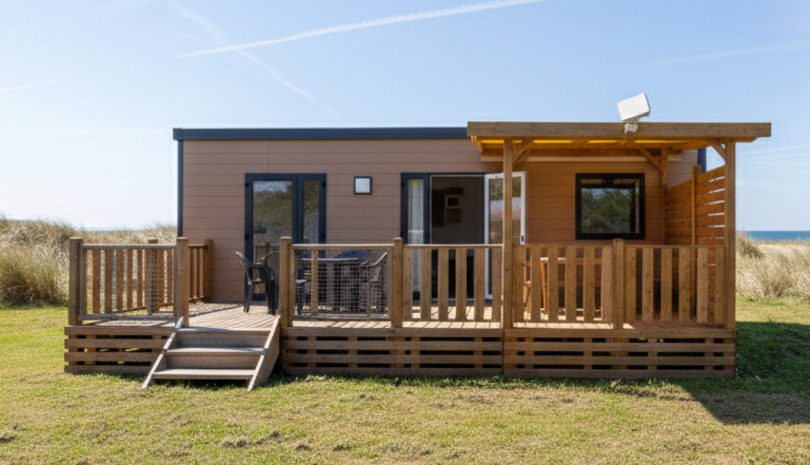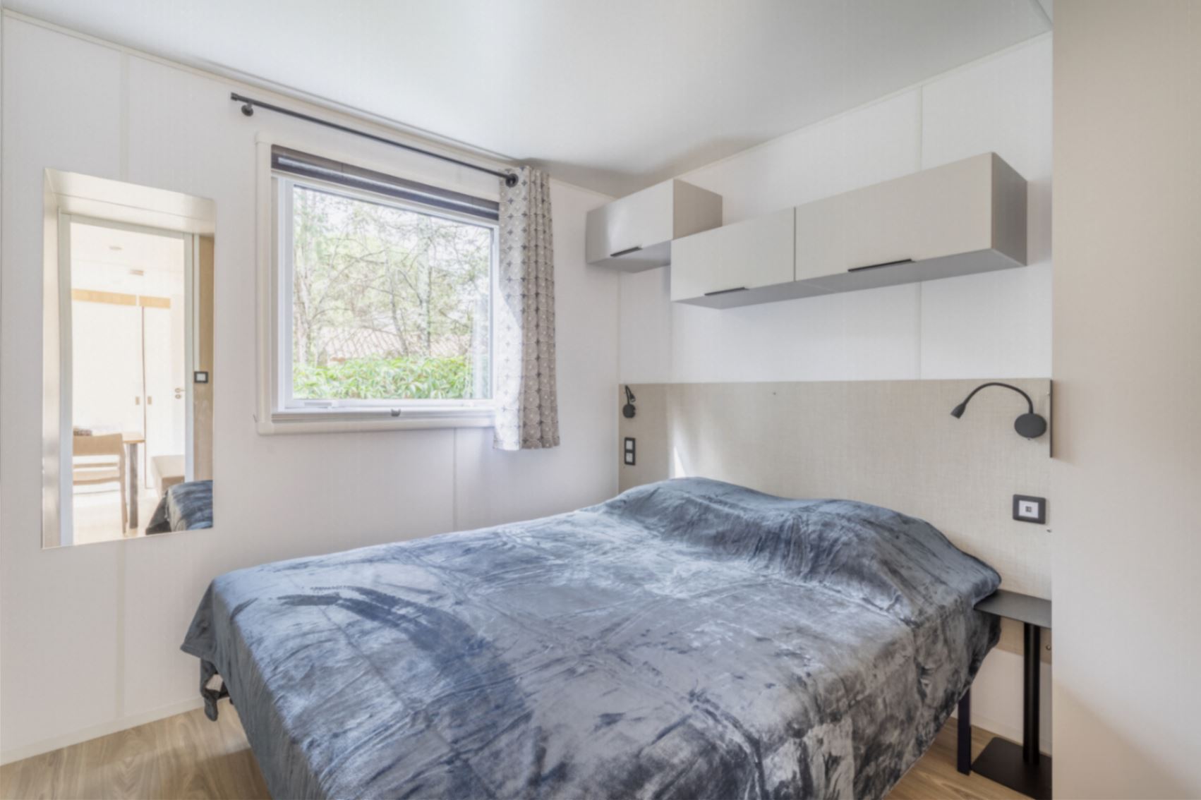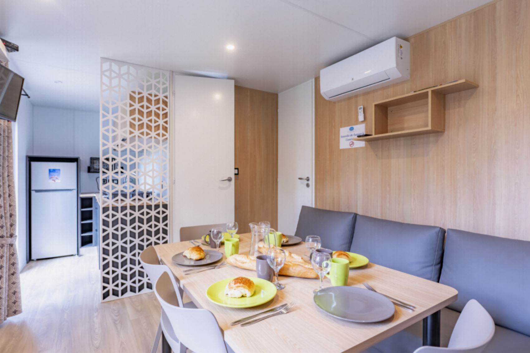 Coin salon/séjour : cuisine équipée (feux gaz, réfrigérateur/congélateur, cafetière à filtre, micro-ondes, vaisselle, lave-vaisselle), climatisation réversible et TV incluse.